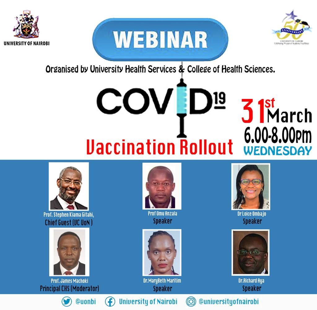 The College of Health Sciences and University Health Services have organized a webinar titled: The Covid-19 Vaccination Rollout' on Wednesday March 31, 2021 from 6-8 pm.
