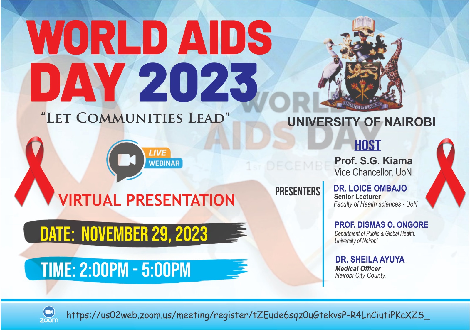 Dec 01 December 1, 7:00 am On Friday, December 1, 2023 the University of Nairobi will join the world in the annual commemoration of World AIDS Day celebrations. The event will take place at the University's Taifa Hall from 8am. There will be free screening at the event.