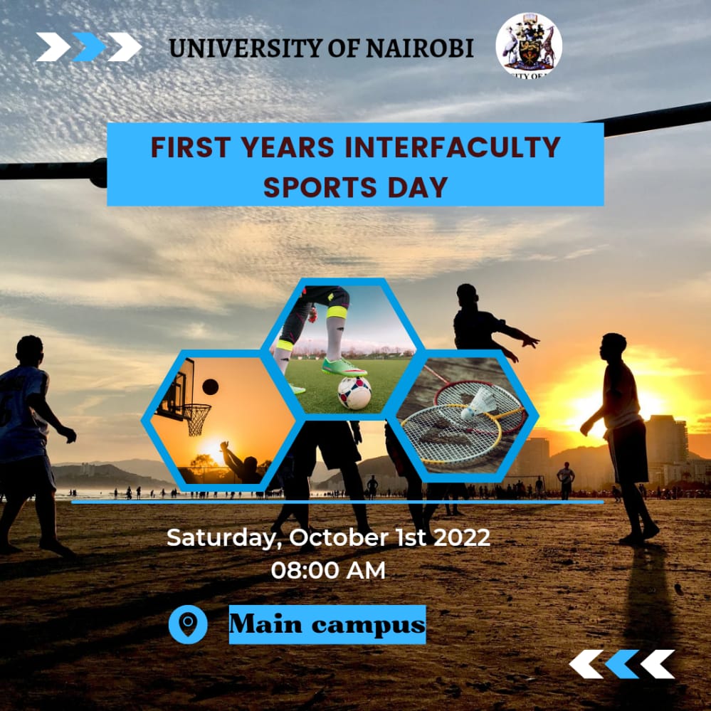 Oct 01 October 1, 8:00 am Where Main Campus Where Main Campus The University of Nairobi first years' inter-faculty sports day is scheduled for 1st October, 2022 in Main Campus.