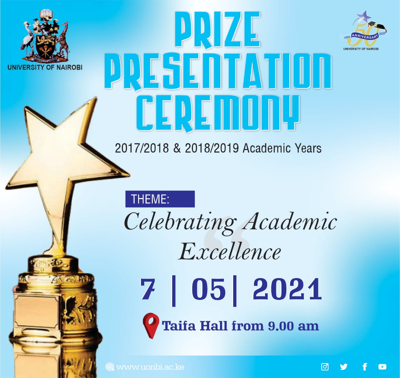 The University of Nairobi has organized a Prize Giving Ceremony for 2017/2018 and 2018/2019 Academic Years scheduled for 7th May, 2021.