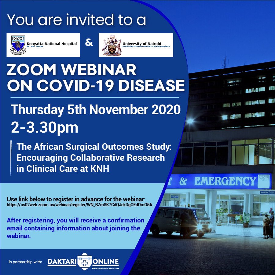 Join us for a CME on The African Surgical Outcomes Study: Encouraging Collaborative Research in Clinical care at KNH from 2pm EAT, hosted by Kenyatta National Hospital in partnership with University of Nairobi and Daktari Online. Register on http://bit.ly/2LEvDO3